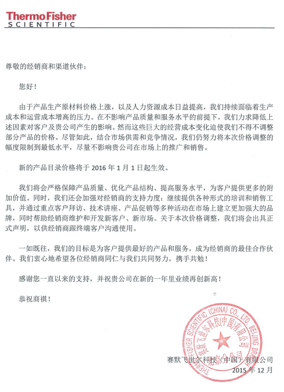 2016年賽默飛世爾科技(中國(guó))有限公司價(jià)格調(diào)整聲明