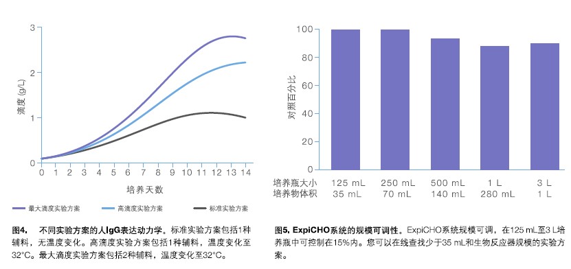 ???????? ExpiCHO表達(dá)系統(tǒng)將高表達(dá)的CHO細(xì)胞系、化學(xué)成分確定的無動(dòng)物源性培養(yǎng)基、優(yōu)化的培養(yǎng)輔料以及高效轉(zhuǎn)染試劑相結(jié)合,它們協(xié)同作用,滴度較GibcoTM FreeStyleTM CHO? 表達(dá)系統(tǒng)高160X,較GibcoTM expi293表達(dá)系統(tǒng)高3X。人lgG的表達(dá)水平可達(dá)3g/L(圖1)。