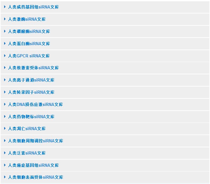 ?????? ? PANTHER為建立這一類siRNA文庫,生物信息學(xué)團(tuán)隊(duì)?wèi)?yīng)用PANTHER (www.pantherdb.org) 和Gene Ontology?注釋信息來創(chuàng)造最新的目標(biāo)基因集。收集到的siRNA會(huì)進(jìn)行排序(最小1 nmol),不僅給予您最新的siRNA文庫,而且讓您隨意地定制您的文庫,為您制定特殊的實(shí)驗(yàn)計(jì)劃提供最大的方便。想添加siRNA到您感興趣的集合中嗎?沒問題!我們可以提供96孔或384孔板的siRNA,實(shí)現(xiàn)每板多等分,對(duì)siRNAs進(jìn)行自定義配置,提供單獨(dú)和/或混合文庫siRNA。