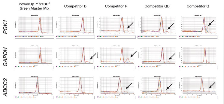 在采用PowerUp? SYBR? Green預(yù)混液評(píng)估24種不同的引物組時(shí),無(wú)需進(jìn)行引物優(yōu)化或重新設(shè)計(jì)引物,即可通過(guò)100%反應(yīng)獲得單一熔解曲線。相反,在采用幾個(gè)品牌的預(yù)混液時(shí),在分析一些相同的靶標(biāo)時(shí),出現(xiàn)了非特異性擴(kuò)增,熔解曲線之中出現(xiàn)了多個(gè)峰。