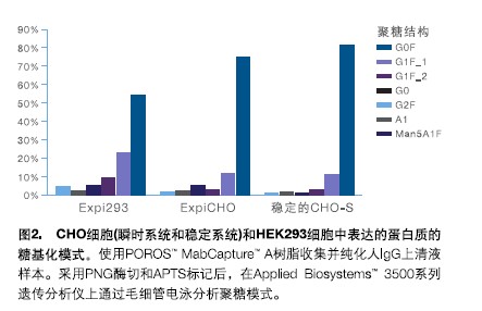 ???? ExpiCHO 表達(dá)系統(tǒng)將為CHO細(xì)胞在早期候選藥物帥選階段用于瞬時(shí)蛋白表達(dá)帶來變革。Expi293和ExpiCHO瞬時(shí)表達(dá)系統(tǒng)生成的重組lgG? 的糖基化模式與穩(wěn)定的CHO細(xì)胞中表達(dá)的相同的蛋白質(zhì)糖基化模式類似。毫無疑問,ExpiCHO系統(tǒng)生成的重組lgG的糖基化與穩(wěn)定的CHO細(xì)胞系統(tǒng)的糖基化更相似(圖2),它可以在瞬時(shí)表達(dá)的候選藥物和CHO中生產(chǎn)的下游生物治療藥物之間建立極強(qiáng)的相關(guān)性。